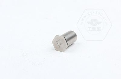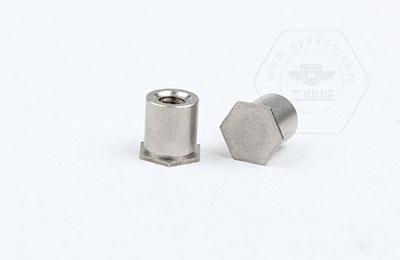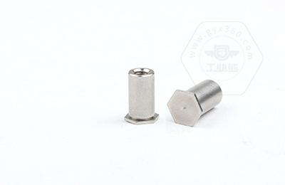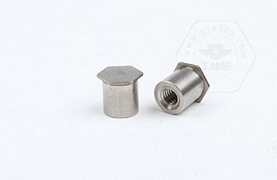 通過壓力機將六角頭壓入薄板的預置孔內(nèi)(預置孔的孔徑一般略大于壓鉚螺柱的圓柱外徑)使孔的周邊產(chǎn)生塑性變形,變形部分被擠入壓鉚螺母柱的退刀槽內(nèi),使壓鉚螺母柱鉚緊于薄板上,從而在薄板上形成一下有效固定的內(nèi)螺紋。
