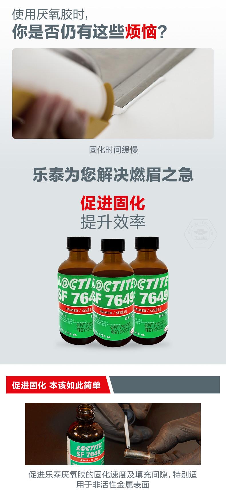樂泰SF7649是一款用于表面處理、促進(jìn)固化的溶劑型促進(jìn)劑。樂泰SF7649適用于惰性金屬表面,可促進(jìn)樂泰厭氧膠在非活性金屬表面的固化速度,并兼顧大間隙填充需求。對于需要加快固化速度、間隙較大,或一般在10℃以下使用促進(jìn)劑的場景,樂泰SF7649更有針對性。樂泰SF7649規(guī)格為1.75oz和4.5oz,外觀為透明、綠色,溶劑類型為丙酮,溶劑揮發(fā)時間30-70秒,粘度2mPa·s,在件壽命≤30天,質(zhì)保期18個月(8-21℃陰涼干燥處)。