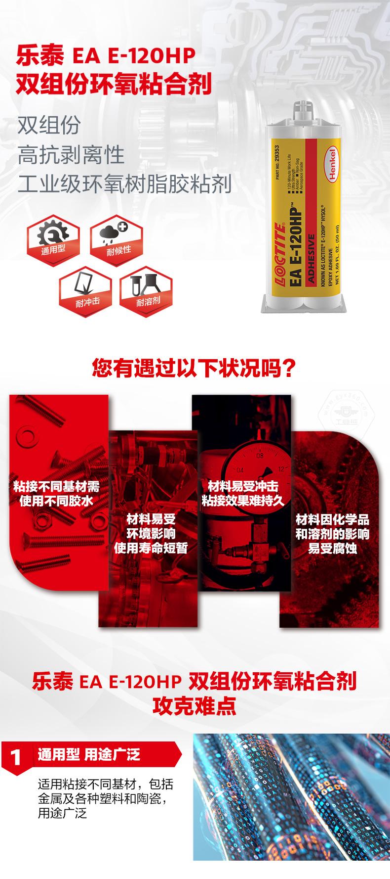 樂泰EA E-120HP雙組份環(huán)氧粘合劑是一款雙組份、通用型、具有高抗剝離性的工業(yè)級環(huán)氧樹脂膠粘劑。樂泰EA E-120HP雙組份環(huán)氧粘合劑具備耐候性、耐沖擊和耐溶劑性能,可用于鋁、鋼和其他金屬,以及各種塑料和陶瓷的粘接。樂泰EA E-120HP雙組份環(huán)氧粘合劑適合需要高沖擊力和高剝離強度的低應力、一般工業(yè)應用。